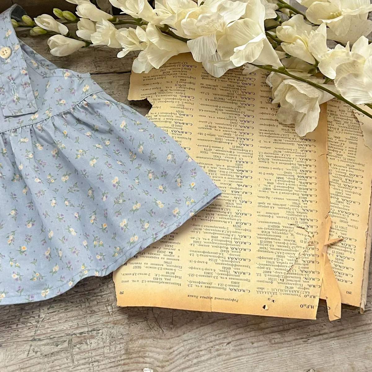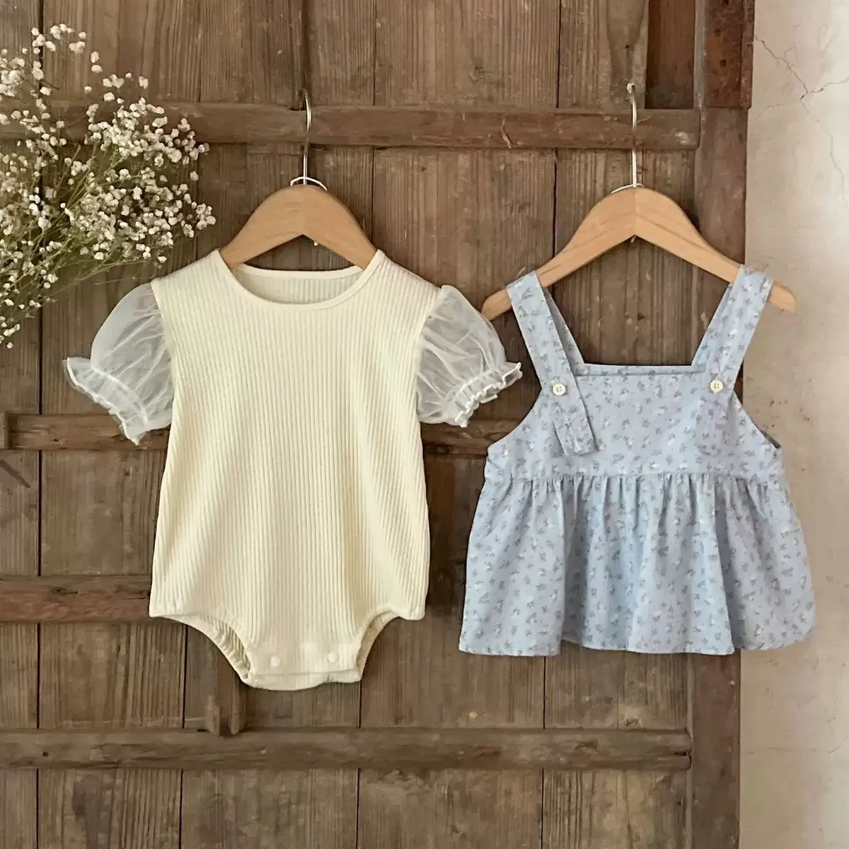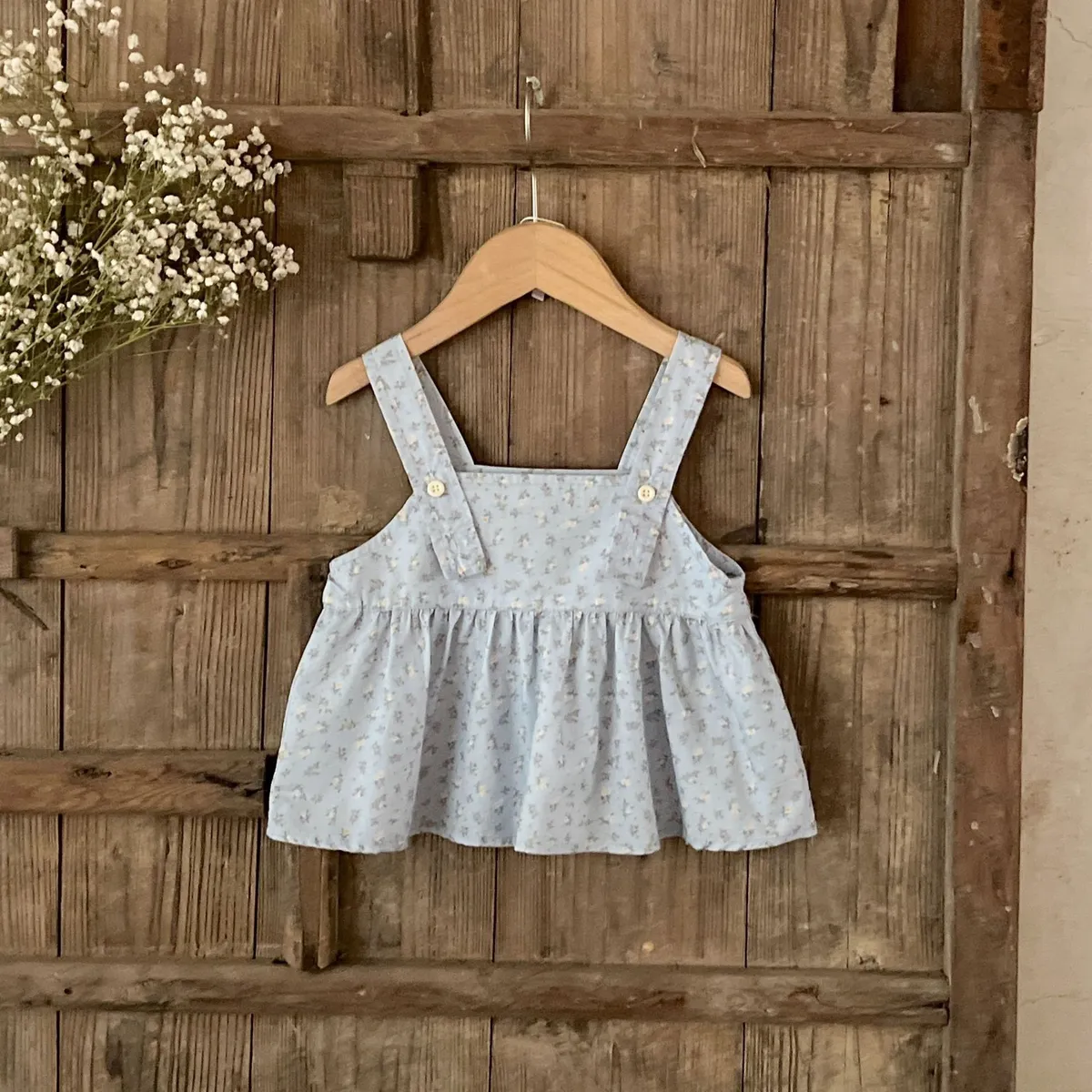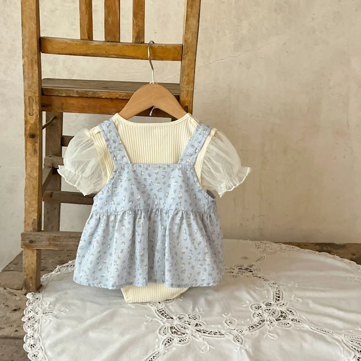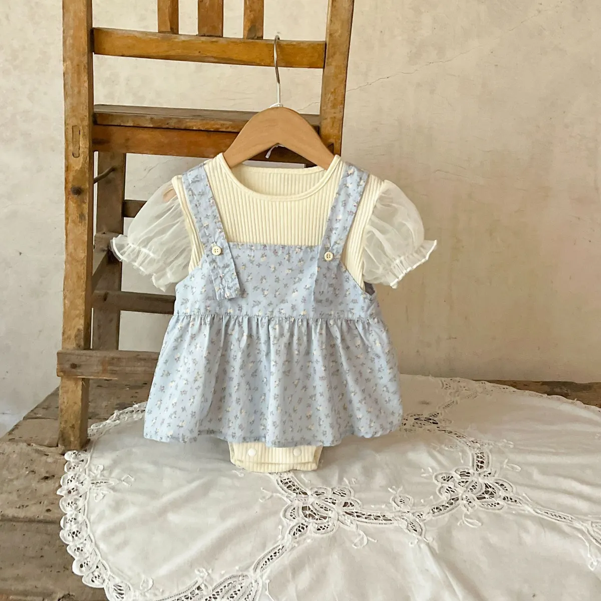 ➰女寶寶夏季純棉藍色碎花吊帶套裝嬰兒包屁